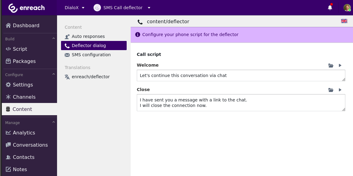 The SMS Call Deflector will start the converstion with the Welcome message from the 'Deflector dialog'. Then it will ask the customer on which phone number they can be reached via a text message. After receiving their phone number, an SMS will be sent, followed by notifying the customer with the Close message of the dialog. Go to the content section and open the 'Deflector dialog'. Here you can configure the messages sent to the customer.