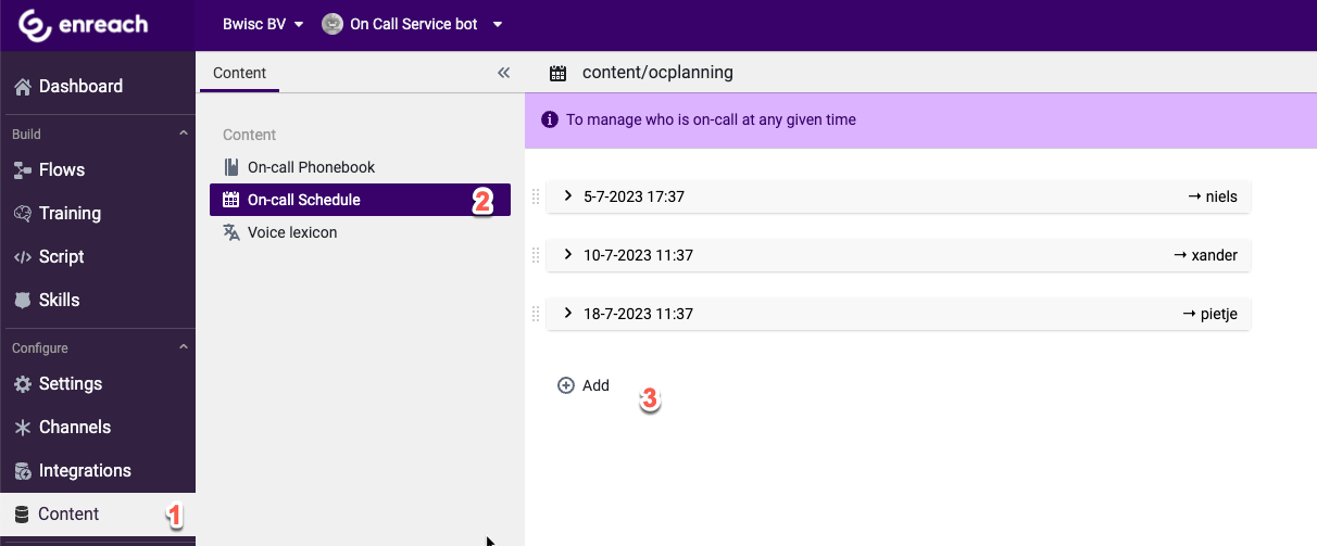 After installing the skill you can simple add the node "Dial: On Call" to your flow and configure your agents and planning in the Content section of the platform. Using this approach even users without the right to edit your flows can change the On call schedule of your agents.&#x20;