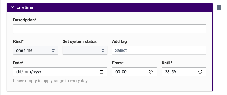 | Date              | Define the exact date at which this timeplan becomes active                        | Only when Kind is configured as "One time"                                                                                                                           |