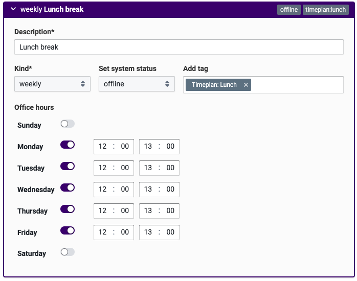 | Office hours      | Define a time period per week day                                                  | Only visible when Kind is configured with "Weekly"                                                                                                                   |