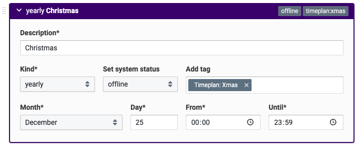| Month and day     | Define the month and day at which this Timeplan should be active on a yearly basis | Only visible when Kind is configured with "Yearly". Notice that when 29/2 is selected for example, the system will automatically fallback to 28/2                    |
