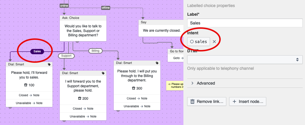 Local intents can be recognized by the circle icon in front of their name (see "done" and "talk_to_someone" in the example above). They are specific to a certain dialog or question (prompts or asks). For example, when someone says "Yes", "No", or "8:00 PM". These kinds of replies are always tied to a question or part of a dialog, and are not acted upon without any context. Local intents can be used in specific Ask nodes in your flow. This can be in labelled, or dialog trigger links: