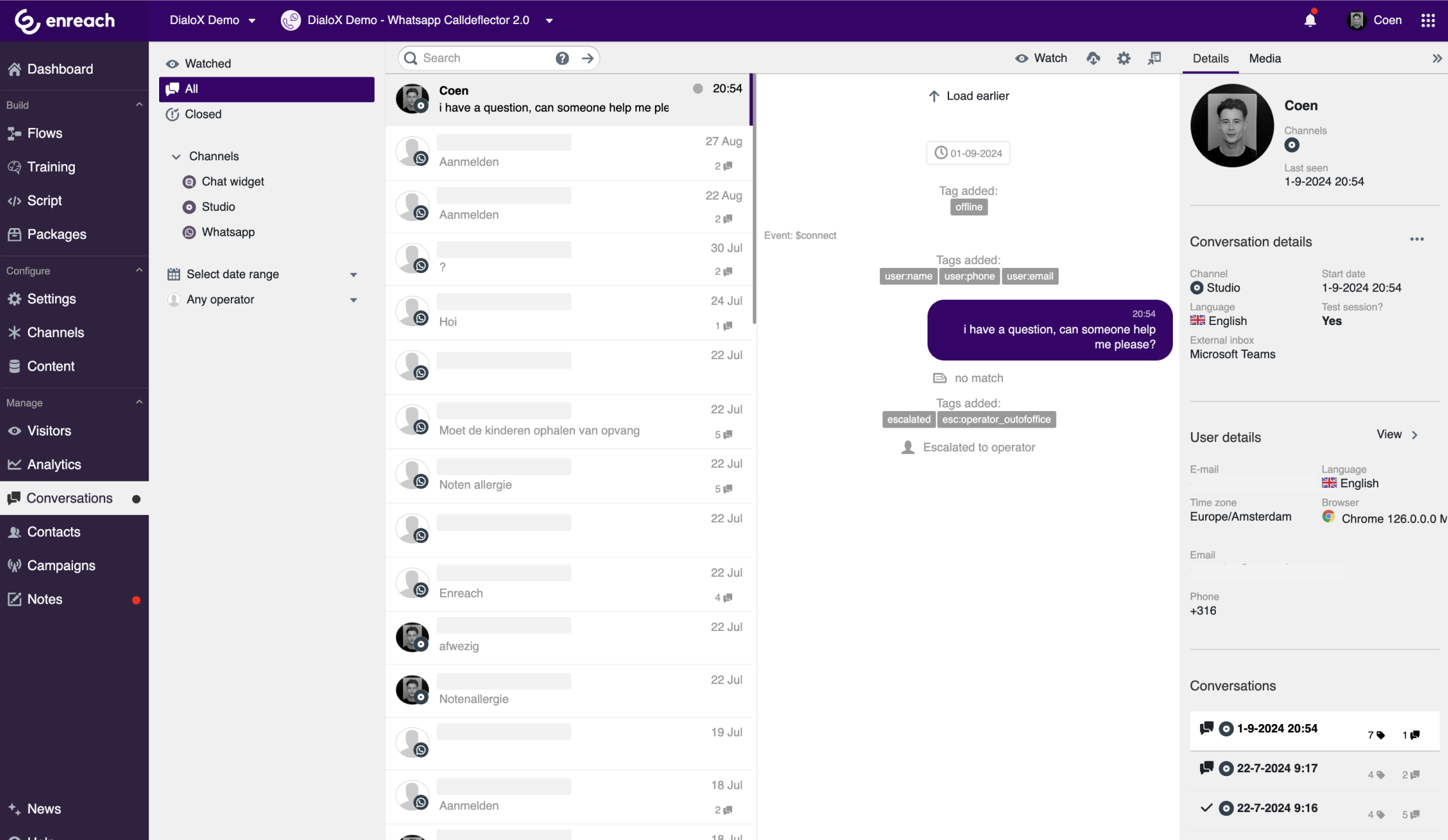 As you can see above the Conversations are equipped with robust filter functions that help users efficiently organize and manage conversations. These filters allow users to sort messages based on criteria such as channel type (e.g., SMS, email), customer status (e.g., new, ongoing, resolved), assigned agent, or specific keywords.&#x20;