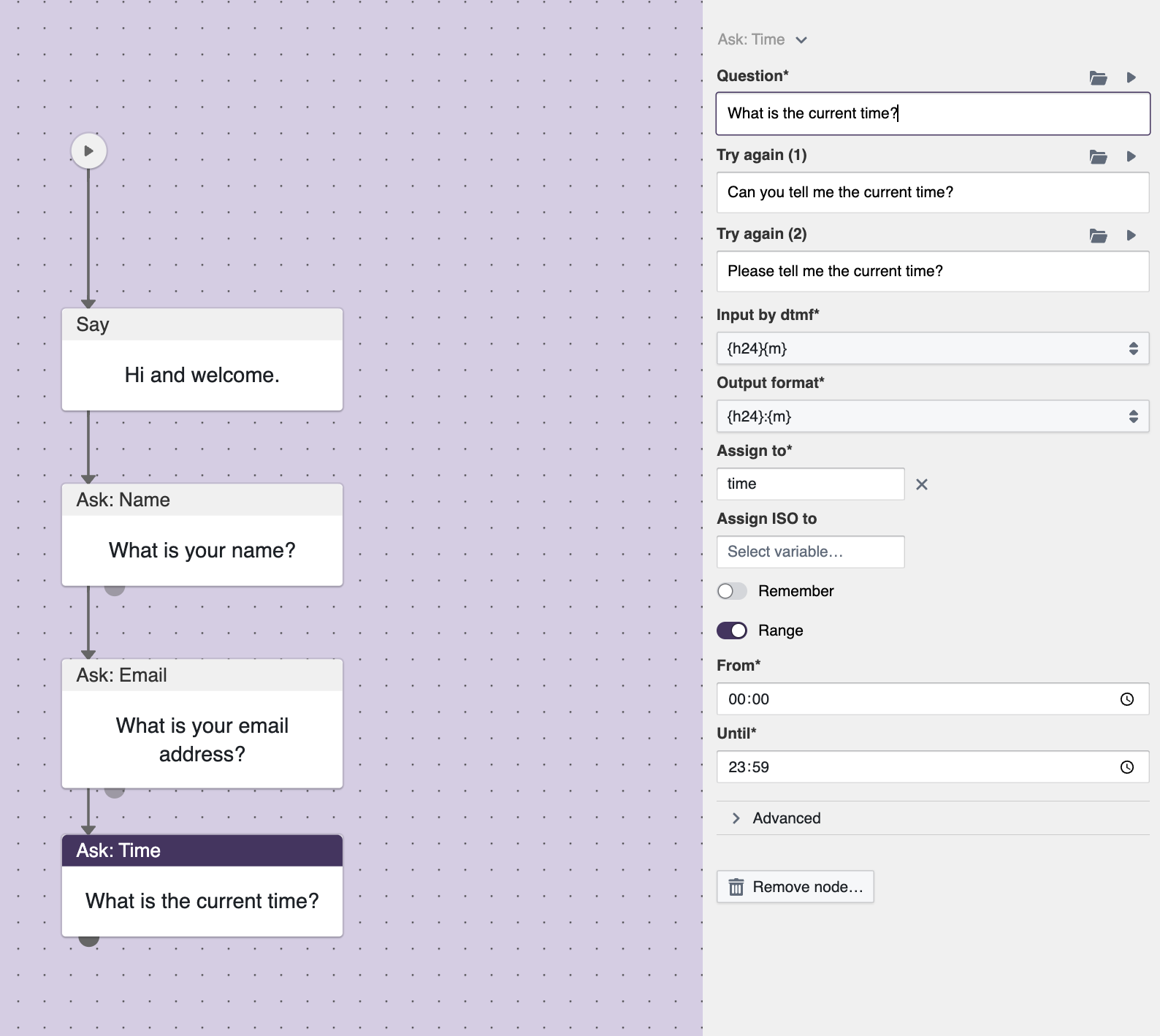 The **Ask: Time** node helps to elicit time inputs, since times are a special entity that needs careful validation and can be bound to various constraints, like from and until, am/pm or 24-hour clock, etc. For this reason, time is a special node variant you can add to your Flow when acquiring a time.