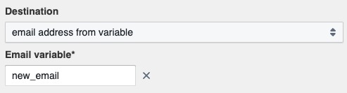 If "email address from variable" is selected as the destination, the email address will be fetched dynamically from the variable entered in the "email\_variable" field: `new_email` in the below example.